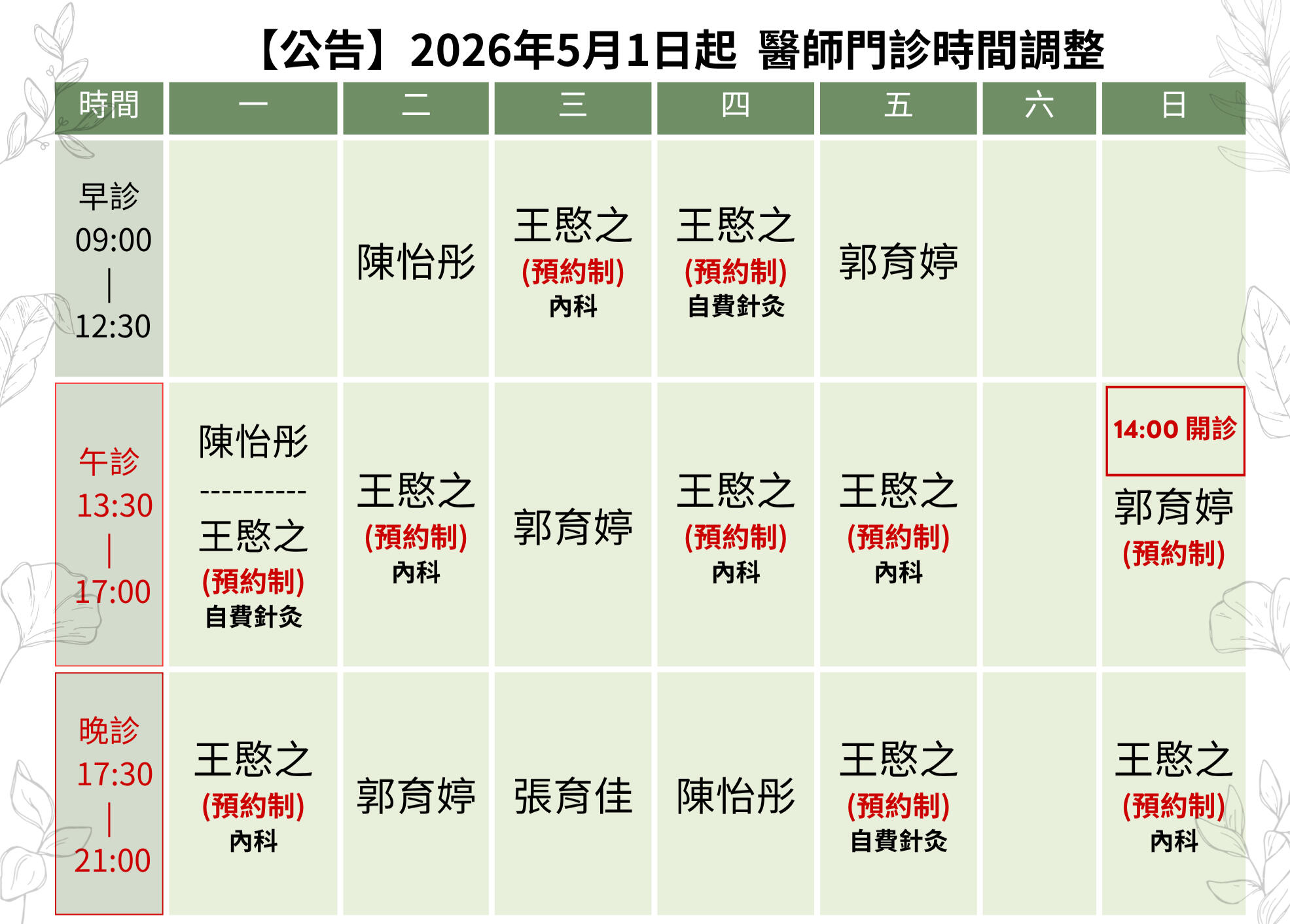 ★截止掛號時間:早診12:15,午診17:15 (周一、三 為16:45),晚診21:15★開診前15分鐘開放掛號及預約報到★參考線上看診進度『預約者可在截止掛號時間前先電話報到』★預約後若因故無法前來,需於『開診前一個工作日』取消預約。120天內未取消預約達3次者,將停止預約功能120天。