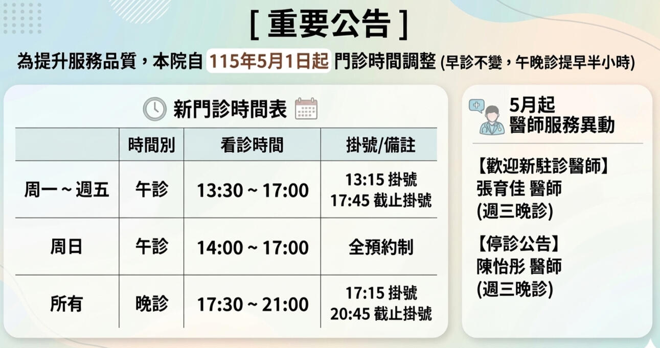 ★截止掛號時間:早診12:15,午診17:15 (周一、三 為16:45),晚診21:15★開診前15分鐘開放掛號及預約報到★參考線上看診進度『預約者可在截止掛號時間前先電話報到』★預約後若因故無法前來,需於『開診前一個工作日』取消預約。120天內未取消預約達3次者,將停止預約功能120天。